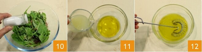 Luego sala 10 y pimienta la ensalada al gusto, después prepara una vinagreta: vierte el aceite de oliva en un cuenco, añade el zumo de medio limón exprimido 11, las hojas de menta picadas y emulsiona todo 12, luego condimenta la ensalada mixta.