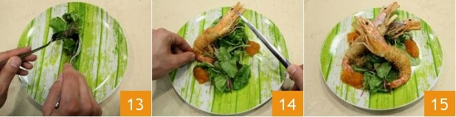 Distribúyela en los platos de servir 13, condimenta también con la mermelada de albaricoque alrededor de la ensalada y coloca tres gambas por porción 14: ¡tus gambas en pasta kataifi con salsa de mermelada de albaricoque están listas para disfrutarse 15!