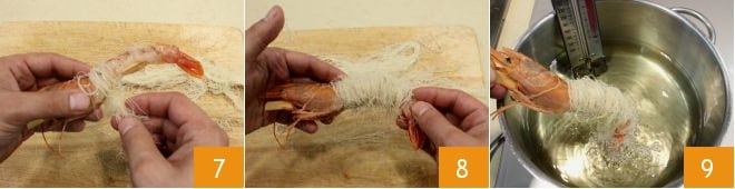 Después envuelve cada gamba comenzando por la cabeza, hasta la cola para cubrir toda la parte central (7-8). Luego fríe pocas gambas a la vez en abundante aceite de semillas caliente, durante unos 3 minutos (la temperatura no debe superar los 170-180°) 9; cuando estén bien doradas, escúrrelas con una espumadera