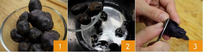 Para preparar los ñoquis de patatas moradas, toma las patatas moradas 1, lávalas cuidadosamente y hiérvelas en agua salada al gusto 2: tomará alrededor de 30-40 minutos (el tiempo se reducirá a la mitad si utilizas una olla a presión). Una vez cocidas, escúrrelas y pélalas mientras están calientes 3.