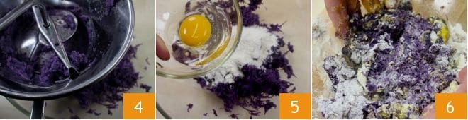 Pásalas por el pasapurés 4 y deja caer la pulpa en un bol, donde puedes añadir también la harina tamizada, el huevo 5 y una pizca de sal. Amasa todo con las manos directamente en el bol 6, hasta obtener una mezcla homogénea y compacta.