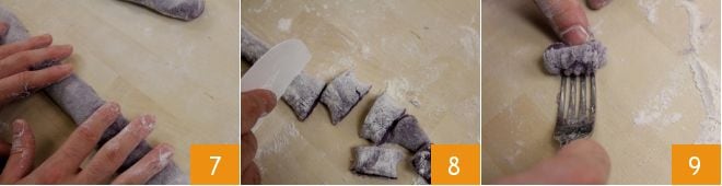 Con la masa obtenida forma unos cilindros 7 que deberás cortar en trocitos 8. Pasa los ñoquis obtenidos por los dientes de un tenedor 9 o por el utensilio adecuado para crear el característico rayado.
