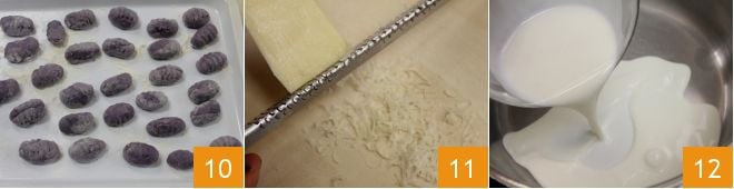 A medida que los prepares, colócalos en una bandeja ligeramente enharinada 10. Cúbrelos con un paño limpio y mantenlos en un lugar fresco por al menos 15 minutos. Mientras tanto, dedícate a la crema de Gruyère: ralla el queso 11, mientras en un cazo viertes la nata 12 y la calientas. Antes de que llegue a hervir,