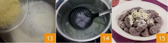agrega el Gruyère rallado 13. Mezcla bien para que se derrita, luego ajusta de sal, pimienta y ralla la nuez moscada para aromatizar. Mientras la crema se espesa a fuego lento, cocina los ñoquis en un cazo grande: bastarán pocos instantes y los ñoquis estarán listos cuando floten en la superficie. Luego escúrrelos con una espumadera 14 y condiméntalos con la crema de Gruyère. ¡Sirve los ñoquis de patatas moradas bien calientes 15!