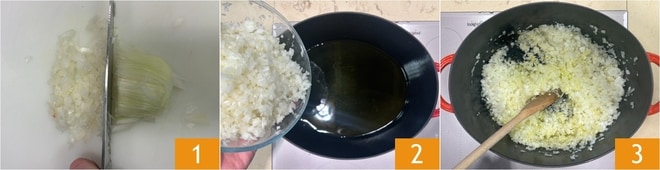 Para preparar el gulash húngaro, primero limpien y piquen finamente las cebollas 1. Calienten una buena cantidad de aceite en una cacerola de hierro fundido, luego agreguen las cebollas 2 y sofríanlas suavemente removiendo con frecuencia 3.