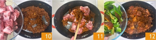 En este punto, añadan la carne 10 y mezclen brevemente a fuego medio 11, luego añadan también los pimientos 12.