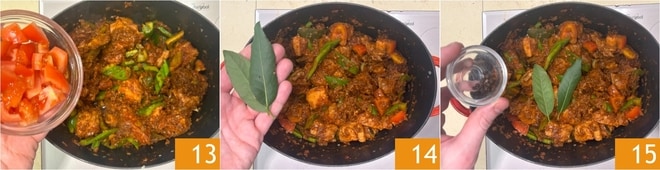 Agreguen los tomates 13 y aromatizen con las hojas de laurel 14 y los granos de pimienta 15.