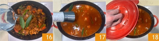 Cubran con agua 16, salen 17 y mezclen, luego cubran con la tapa y cocinen durante una hora y media, removiendo de vez en cuando 18.