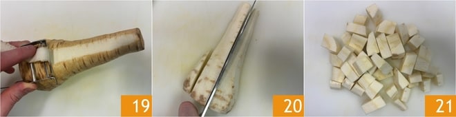 Mientras tanto, preparen las otras verduras: peleen la chirivía 19 y córtenla 20 para obtener cubos de un par de cm 21.