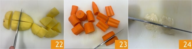 Hagan lo mismo con las patatas 22 y las zanahorias 23, procurando obtener trozos del mismo tamaño que la chirivía. Eliminen el brote interno del diente de ajo y píquenlo finamente 24.