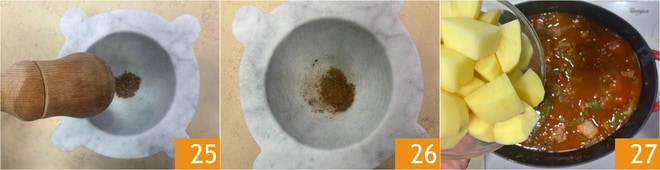 Finalmente, trituren las semillas de comino en un mortero 25 para reducirlas a polvo 26. Pasado el tiempo de cocción, añadan las patatas a la cacerola 27.