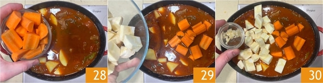 Añadan también las zanahorias 28, la chirivía 29 y el ajo 30.