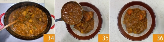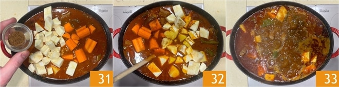 Aromaticen con el comino en polvo 31, mezclen 32 y cubran de nuevo con la tapa. Continúen la cocción durante otros 30 minutos 33.