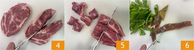 Mientras tanto, corten la carne: deben obtener cubos de aproximadamente 4 cm 4 5. Limpien los pimientos y córtenlos en rombos 6.