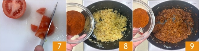 Reduzcan a cubos también el tomate 7. Cuando las cebollas estén sofritas, agreguen el pimentón dulce 8 y mezclen bien; si las cebollas quedan naranjas, refuercen el color con el pimentón picante para que se vuelvan rojas 9.