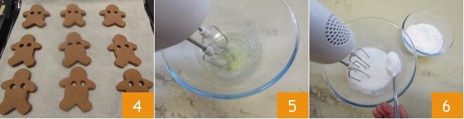 Una vez cocidas, sácalas del horno 4 y déjalas templar, luego déjalas enfriar completamente sobre una rejilla. Mientras tanto, prepara el glaseado: en un bol pequeño bate la clara de huevo con las varillas eléctricas 5 y cuando esté blanca añade poco a poco el azúcar glas 6 hasta obtener una consistencia fluida.