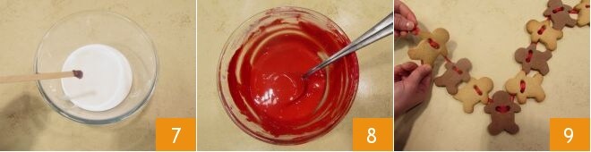 Divide la cantidad de glaseado a la mitad y en una parte añade unas gotas de colorante rojo hasta obtener el color deseado (7-8). Coloca los dos glaseados en dos mangas pasteleras sin boquilla a las que puedes hacer un agujerito en la punta. Luego pasa una cinta por los agujeritos de cada galleta, alternando los muñecos de pan de jengibre con los de masa quebrada 9: deberás realizar dos guirnaldas de aproximadamente 11-12 muñecos cada una.