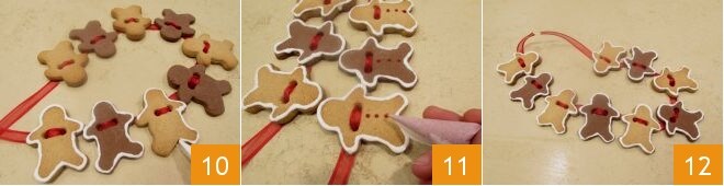 Dibuja los bordes de los muñecos de pan de jengibre y de masa de chocolate y avellanas con el glaseado blanco 10, mientras que haz los botones con el glaseado rojo 11: tu guirnalda de pan de jengibre está lista para decorar tu casa 12.