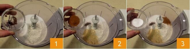 Para preparar el pan de jengibre, coloca en el vaso de una batidora la harina, los clavos de olor en polvo 1, el jengibre, la canela en polvo 2, el bicarbonato 3, el azúcar y una pizca de sal.