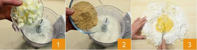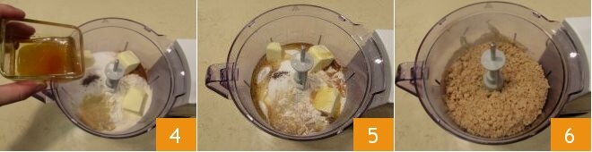 Luego agrega también la nuez moscada rallada, la mantequilla fría de la nevera en trozos y la miel 4. Cuando hayas agregado todos los ingredientes 5, acciona las cuchillas de manera intermitente para no calentar demasiado la masa y crea una mezcla arenosa 6.