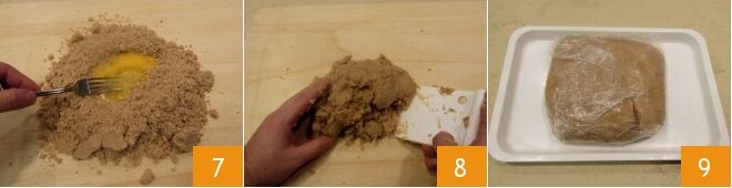 Vuelca la mezcla sobre una superficie de trabajo y forma un volcán, luego agrega la yema 7 y mezcla primero con el tenedor y luego rápidamente a mano para no calentar demasiado la masa. Recoge la masa 8 y forma un bloque, aplánalo ligeramente y envuélvelo en film plástico 9. Deja reposar en el frigorífico por al menos 30 minutos.