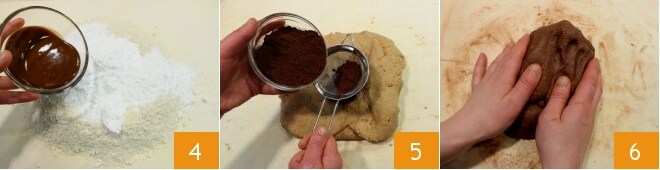 Añade también las semillas de media vaina de vainilla y el azúcar glas y la pasta de avellanas 4 y comienza a amasar rápidamente hasta obtener una consistencia compacta y suave. Espolvorea el bloque de masa quebrada con el cacao amargo tamizado 5, intégralo a la masa 6. Forma un bloque, aplánalo ligeramente y luego envuélvelo en film plástico, y colócalo en el frigorífico para que se endurezca por al menos 30 minutos.