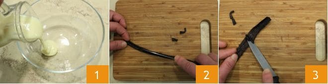 Para realizar el helado de vainilla con nueces crujientes, comienza colocando en un bol grande la leche condensada 1, luego toma la vaina de vainilla, ábrela con un cuchillo afilado a lo largo 2, extrae las semillas 3