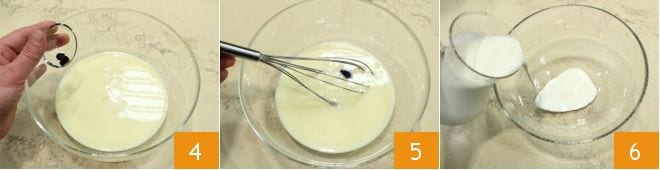 y agrégalas a la leche condensada 4, mezcla con un batidor 5 y reserva. En otro bol vierte la nata fresca líquida 6