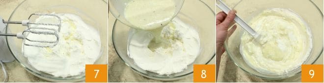 y móntala a punto de nieve firme 7, incorpora a la nata la leche condensada aromatizada con vainilla 8 y mezcla con una espátula delicadamente para no desmontar la nata 9 hasta obtener una mezcla homogénea.