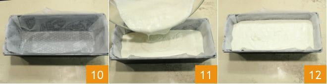 Engrasa un molde o bandeja de borde alto, el de plumcake es perfecto para esta preparación, forra los bordes y el fondo con papel de horno 10 y vierte dentro el helado de vainilla 11. Pon la mezcla en el congelador a solidificar durante 6-8 horas 12.