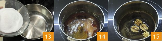 Transcurrido el tiempo indicado, tu helado estará listo, dedícate a la guarnición con las nueces. Pon un cazo al fuego, vierte dentro el azúcar 13 y derrite a fuego bajo el azúcar hasta que se vuelva oscuro 14 y líquido. En este punto apaga el fuego y sumerge las nueces por unos instantes para cubrirlas con el caramelo 15,