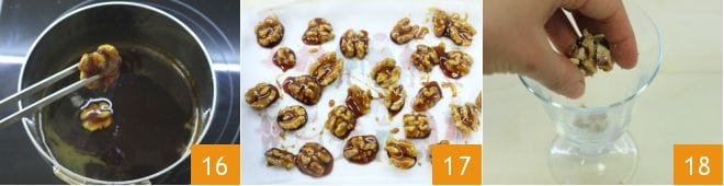 saca las nueces con la ayuda de unas pinzas de cocina 16 y colócalas sobre una bandeja cubierta con papel de horno 17. En este punto puedes componer tus copas de helado: toma una copa de cristal para helado y pon una primera capa de nueces caramelizadas 18,