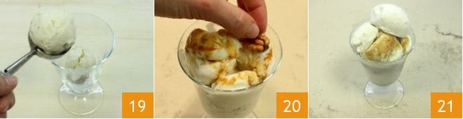 luego coloca una bola de helado 19 y continúa alternando capas de helado con nueces y caramelo 20. ¡Tu helado de vainilla con nueces crujientes está listo para ser disfrutado! 21.