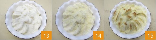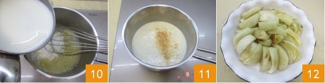 En este punto, vierte la leche caliente 10 y sigue mezclando hasta que la salsa se espese. Por último, sala y aromatiza con la nuez moscada 11. Recoge los hinojos salteados en la sartén y colócalos en una bandeja de horno de 25 cm de diámetro, o lo suficientemente grande como para contenerlos todos en una sola capa. Colócalos en forma de abanico desde el perímetro exterior 12.