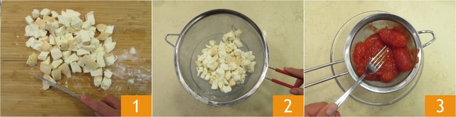 Para preparar los huevos en el pan, corta en cubos la mozzarella ahumada 1. Escúrrela en un colador para eliminar el poco suero que pueda tener 2. Transfiere los tomates pelados a un tamiz y aplástalos con un tenedor para eliminar el líquido 3.