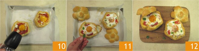 Pimienta 10, sala y cocina nuevamente durante unos 10 minutos hasta que la clara esté cocida. Saca del horno, decora con algunas hojas de orégano fresco 11 y sirve inmediatamente los huevos en el pan 12!