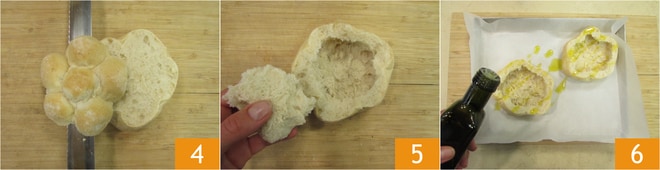 Corta la cúpula de las michette 4, elimina gran parte de la miga 5 y colócalas en una bandeja cubierta con papel de horno. Aliña la base de las michette con un hilo de aceite de oliva virgen extra 6 y sal.
