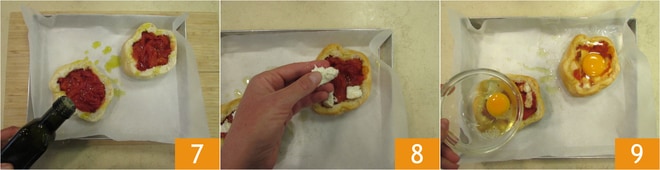 Rellena con los tomates pelados 7 y añade un poco más de aceite. Hornéalos en un horno ventilado precalentado a 190°, durante 5 minutos. Saca del horno y añade la mozzarella en cubos 8, luego vierte cuidadosamente el huevo en el interior 9.
