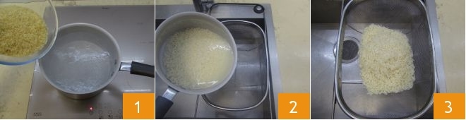 Para preparar la ensalada de arroz con mango y piña, comienza con la cocción del arroz, viértelo en abundante agua salada y hirviendo y déjalo cocinar según los tiempos indicados en el paquete 1. Después escúrrelo 2 y déjalo enfriar a temperatura ambiente 3.