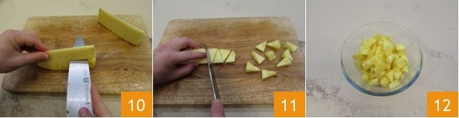 Elimina la parte central 10, que es más dura, y luego coloca las rodajas sobre la tabla de cortar, de este modo conseguirás pequeños triángulos cortando de manera transversal 11; vierte también los triángulos en un recipiente 12.