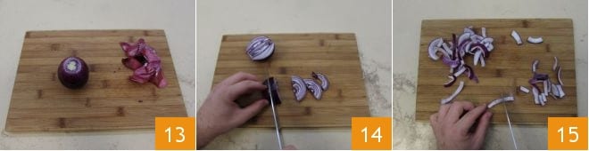 Monda la cebolla roja 13 y córtala en rodajas de aproximadamente 1 cm de grosor 14, finalmente corta las rodajas gruesas recién obtenidas dividiéndolas por la mitad o en 3 partes 15.