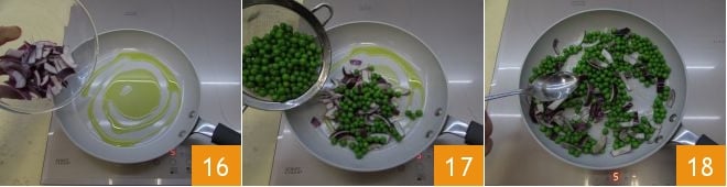 En una sartén, vierte aceite de oliva virgen extra junto con las cebollas 16 y déjalas chisporrotear un instante, luego añade los guisantes 17 y unas cucharadas de agua para prolongar la cocción 18, necesitarás unos diez minutos, solo el tiempo suficiente para ablandarlos un poco. La cocción de la cebolla suavizará el sabor, si prefieres un sabor más intenso no la cocines; si utilizas guisantes congelados, déjalos en agua caliente durante unos diez minutos antes de cocinarlos.