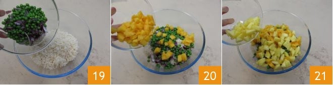 Tan pronto como el arroz y los guisantes estén bien fríos, únelos 19, luego añade el mango en cubos 20 y la piña en triángulos 21.