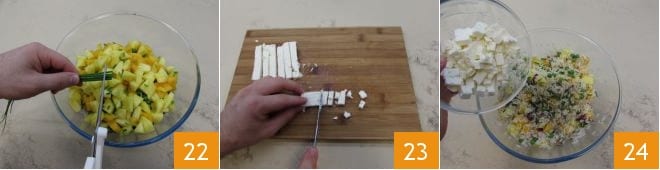 Corta con las tijeras un poco de cebollino 22. Finalmente corta también el queso feta en cubos 23 y únelos a la ensalada de arroz junto con una pizca de pimienta negra molida 24.
