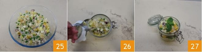 Mezcla bien todos los ingredientes 25 y si quieres una forma original de servirla, vierte la ensalada de arroz a cucharadas dentro de tarritos de vidrio, obtendrás 6 utilizando los de una capacidad de 350-400 ml 26 y finalmente colócalos en el frigorífico decorando con un poco de menta fresca en cada tarro 27. ¡Después de unas horas en el frigorífico, tu ensalada de arroz con mango y piña estará lista para disfrutar!