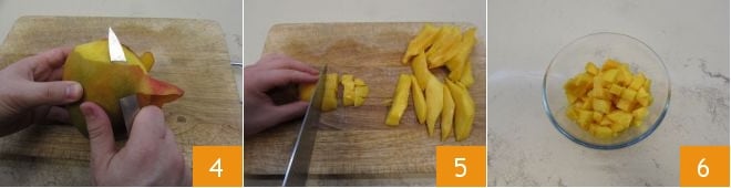 Mientras tanto, ocúpate de la fruta, pela el mango 4, luego córtalo en tiras y finalmente en cubos de aproximadamente 1 centímetro 5, recógelos y mantenlos aparte en un recipiente 6.