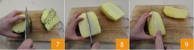 Procede a Cómo limpiar y cortar la piña: elimina ambos extremos de la piña y luego quita la cáscara y cualquier residuo 7. Córtala por la mitad en sentido longitudinal obteniendo dos mitades 8, y continúa cortando otra vez por la mitad, siempre en sentido longitudinal, hasta obtener 8 partes en total 9.