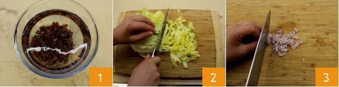 Para preparar los rollitos de col rellenos de arroz y escarola, pon al fuego una olla con abundante agua salada para preparar el Caldo de verduras. Mientras tanto, toma las pasas, colócalas en un bol y cúbrelas con agua tibia para que se ablanden 1, dejándolas en remojo durante al menos 10 minutos. Ahora pasa a las verduras: lava la escarola bajo agua fresca corriente, córtala en tiras 2 y resérvala, luego pica finamente la chalota, que será la base del sofrito 3.