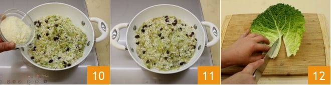 Sala y pimienta a tu gusto, después, una vez que el arroz esté listo, apaga el fuego y deja que se mezcle añadiendo el pecorino rallado 10. Deja que el arroz se temple 11 y encárgate de la col; deshoja la col y quita la vena central, cortando con un cuchillo un triángulo 12. Mientras tanto, pon al fuego una olla con abundante agua salada que servirá para hervir la col.