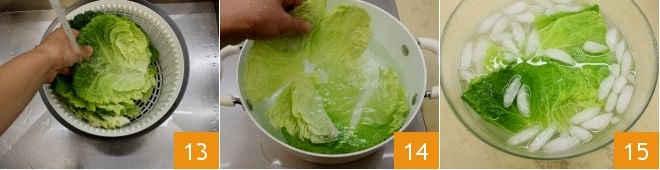 Lava bien las hojas pasándolas bajo agua fresca corriente 13 y, cuando el agua haya alcanzado el punto de ebullición, cuécelas durante unos minutos 14. Mientras, prepara un bol grande con agua y hielo que servirá para detener la cocción de la col y hacer que las hojas mantengan un color brillante; después de haber escaldado las hojas, escúrrelas y colócalas por unos instantes en el recipiente que has preparado 15.